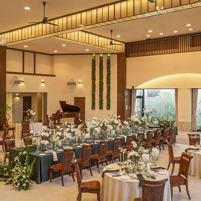 全天候型のウォーターガーデンを備えており、季節や天候を問わず、自然を感じながらパーティをお楽しみいただけます。